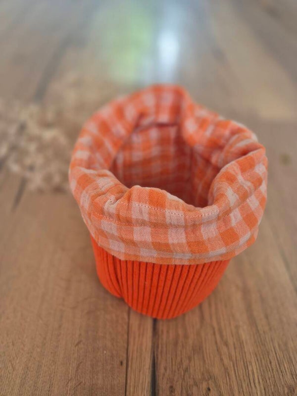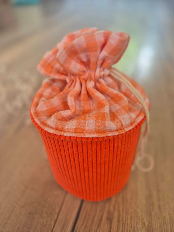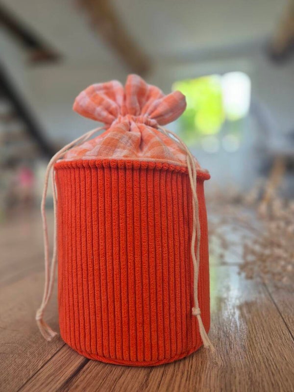 Craquez pour ce pochon cylindrique fait main, au charme chaleureux et rétro. Avec son tissu côtelé orange vif et son haut à motifs vichy dans des tons doux d’orange et de blanc, il évoque la convivialité et la douceur de l’automne.