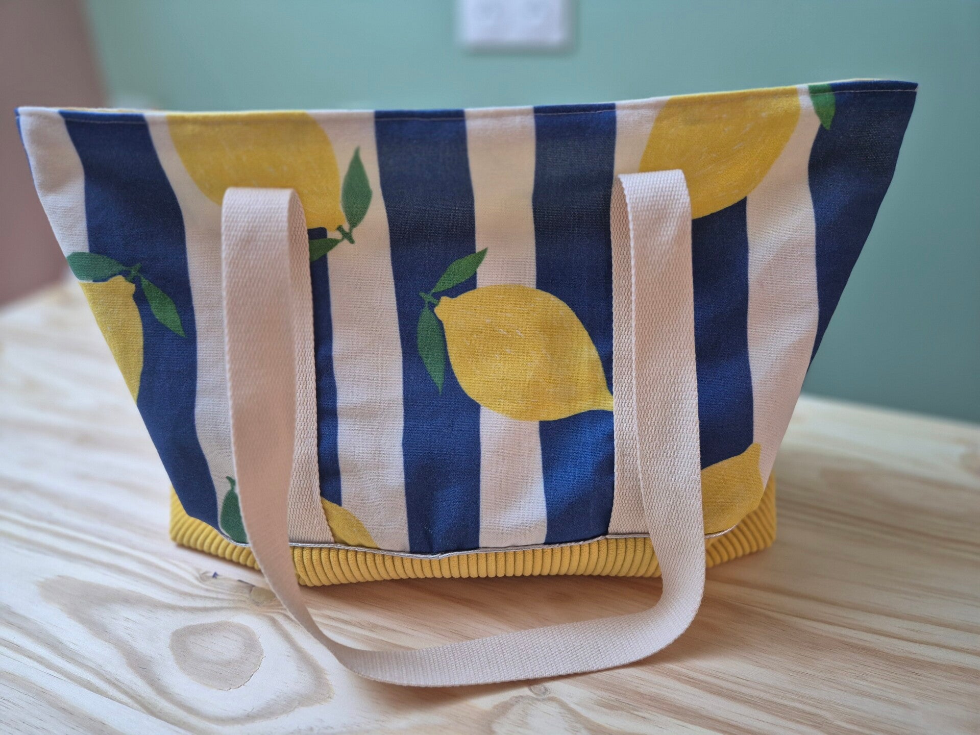Confectionné à la main avec soin dans mon atelier, ce sac associe un tissu à rayures bleues décoré de citrons lumineux à une base en velours côtelé jaune qui lui apporte solidité et caractère.