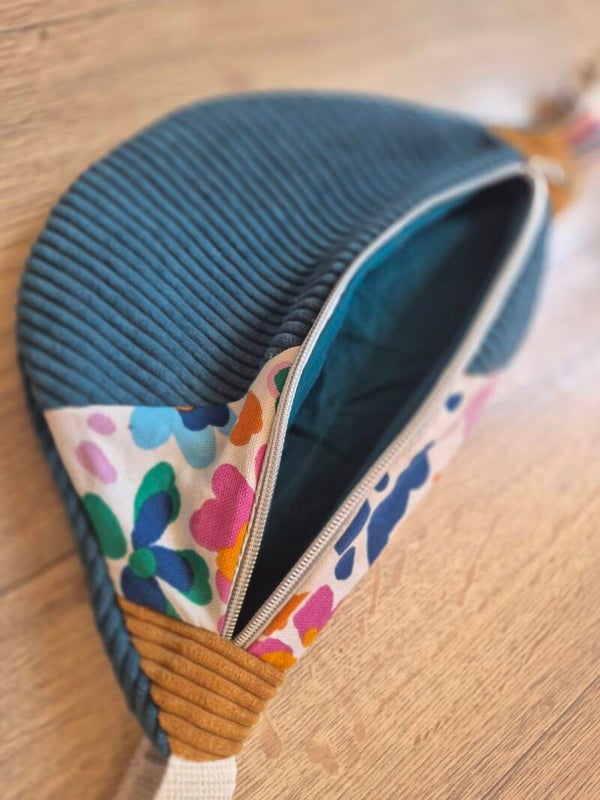 Son mélange de matières et de couleurs lui donne un look moderne et unique. La partie en velours côtelé apporte de la douceur et du relief, tandis que le tissu imprimé coloré ajoute une note joyeuse et dynamique. Chaque détail a été pensé pour créer un accessoire à la fois esthétique et pratique.
